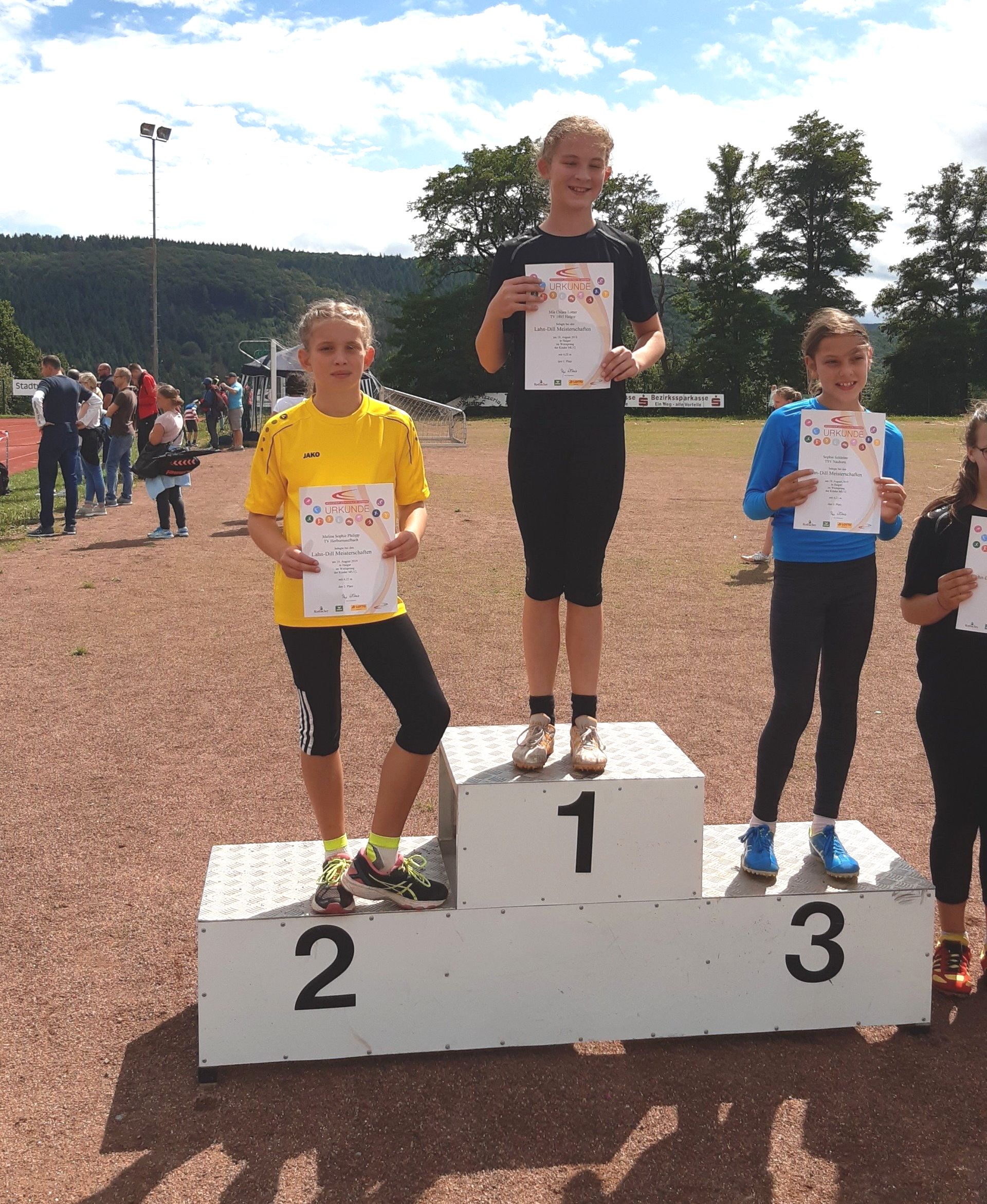 Hannah Kristin Gerlach reached the ball throw final of the best 8 and became Vice Lahn-Dill Champion with 20.50m, taking second place. Hannah Kristin also reached the final in the long jump and came 7th with 3.20m. In the sprint she just missed the final with 8.93sec and came 7th. Josephine Ciliox came 5th in the ball throw final with 18.50m. Jonah Stahl came 3rd in the high jump with 1.15m, a very good 1st place.